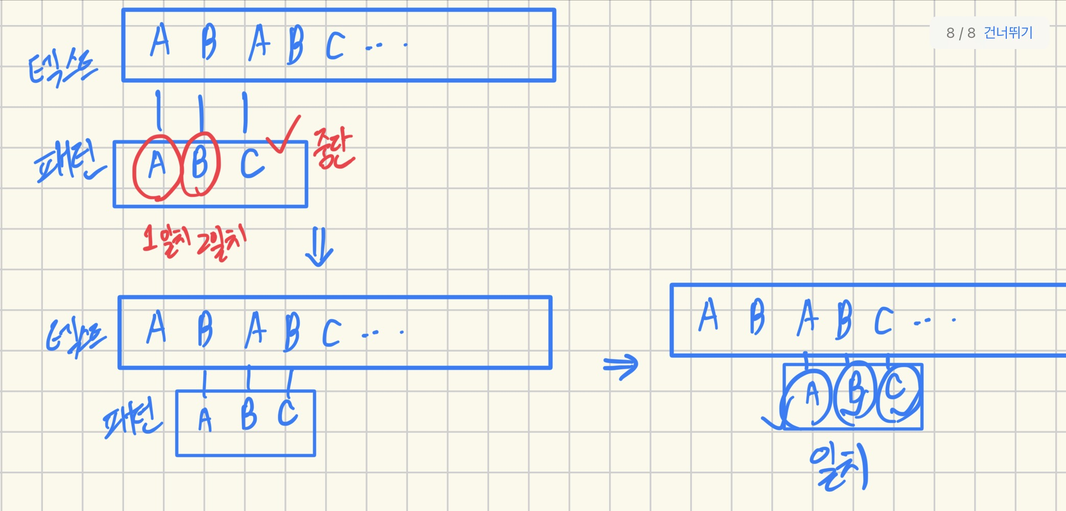 순서대로 일치하는지 검사한다. - 문자가 일치하면 계속해서 패턴과 텍스트의 문자를 검사한다.