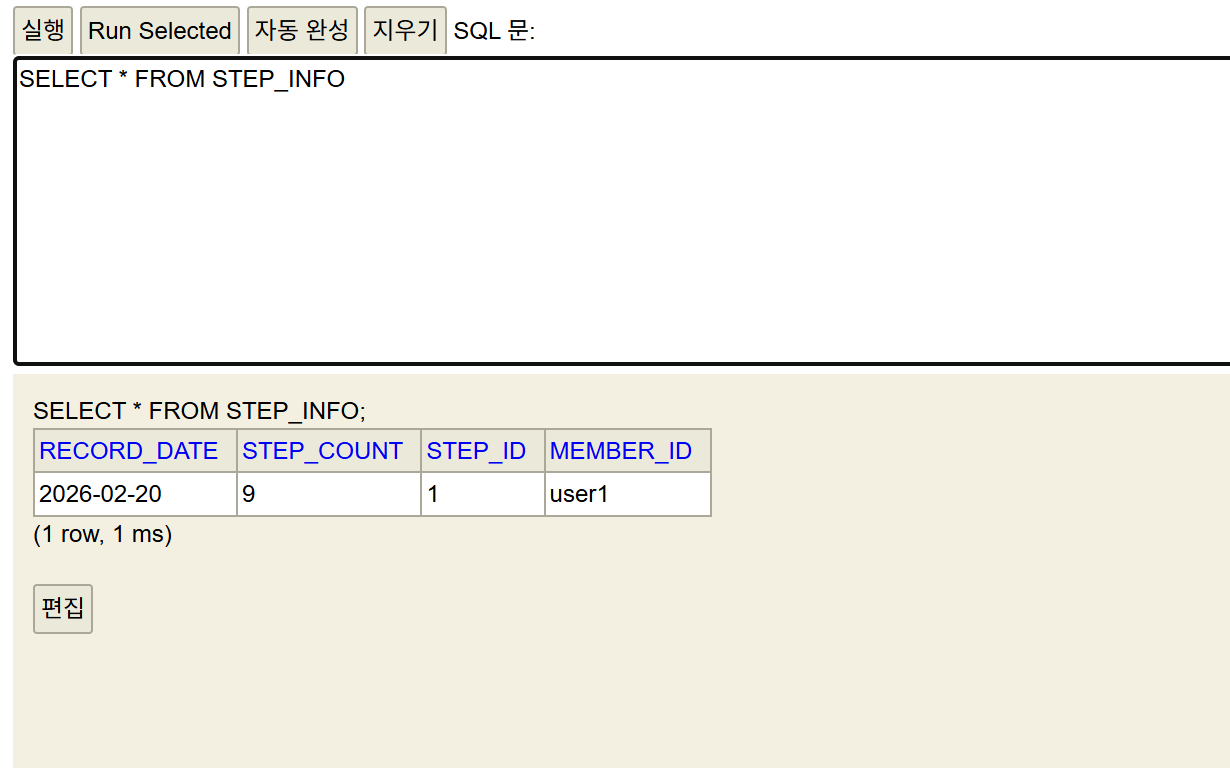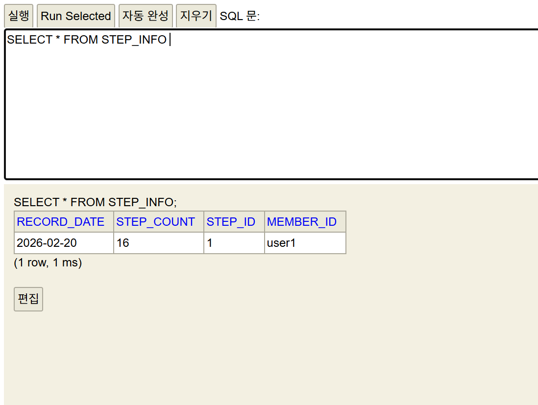 다른 부가적인 로직들을 더 개발하기 전에 정말로 연동이 되어서 걸음 수가 DB에 저장이 되는지 확인하고 넘어가기로 결정했다!
